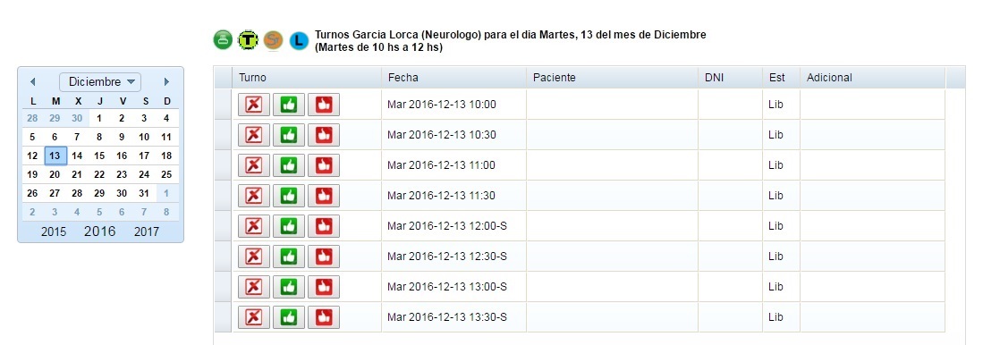 | Detalla el especialista y la fecha de la lista de turnos en el encabezado. Informa los horarios del profesional. Los turnos para los profesionales y secretarios tienen una vista completa de un día. Inicialmente, al elegir un profesional se cargan los turnos del día actual. La fecha se va cambiando desde el calendario que está a la izquierda. Los turnos pueden empezar en cualquier momento del día, y con el tiempo de turno que el profesional necesite en cada día. Es decir, por ejemplo, los Martes pueden ser turnos de 10 minutos, los Miércoles de 15 minutos y los Viernes de 60 minutos para cada profesional. Otro beneficio es que cada profesional puede disponer de la cantidad de días de sus turnos, puede ser un día, una semana, un mes o lo que consdere necesario. Los estados posibles del turno son; Libre(puede ocuparse o anularse),Anulado(puede volver a libre), Ocupado(puede cancelarse o cumplirse) o Finalizado(Cumplido o Ausente). La informacion de la lista se puede ordenar por cualquiera de las columnas. Además, haciendo click sobre un turno ocupado muestra los datos del paciente que tiene el turno. | ||||||