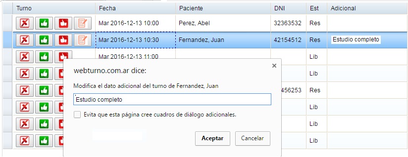 Haciendo doble click sobre un turno tomado se puede cargar un dato informativo para que el profesional vea al momento de atenderlo. La informacion ingresada se muestra en la columna Adicional. ![]() | ||||||