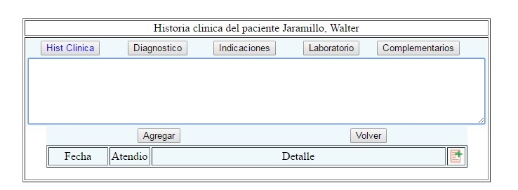 ![]() El botón permite agregar un nuevo detalle de Historia Clínica guardando como datos automaticamente el profesional y la fecha. | ||||||